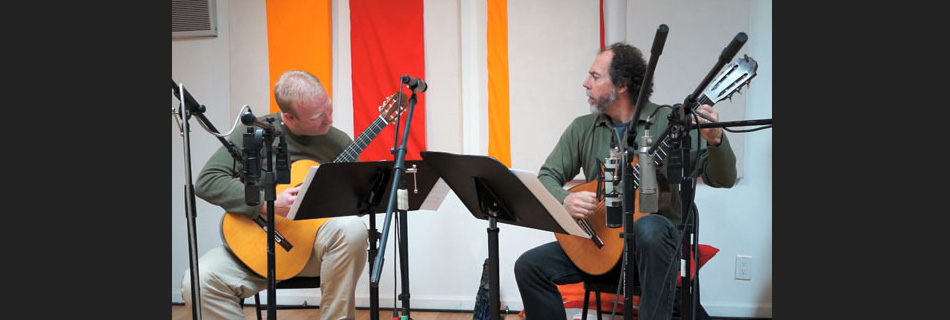 Andy and I rehearsed at his house just one time for maybe an hour and a half, and then we had lunch for about two hours. The next time I saw him, we were sitting in front of recording studio microphones. So it went pretty fast. I think we were able to get a little more practice in while they were checking the levels. So there was very little rehearsal, and an incredibly hard piece. I figured I would play guitar one since I had arranged the piece. It was a choice I would get punished for. They also handed us guitars we had never played before for the session. I was playing a short scale 1971 Friederich with incredibly high action. So it’s this tiny little guitar with huge action, and I’m trying to play this crazy stuff on it. Andy was pretty comfortable on a 56’ Bouchet which was beautiful.