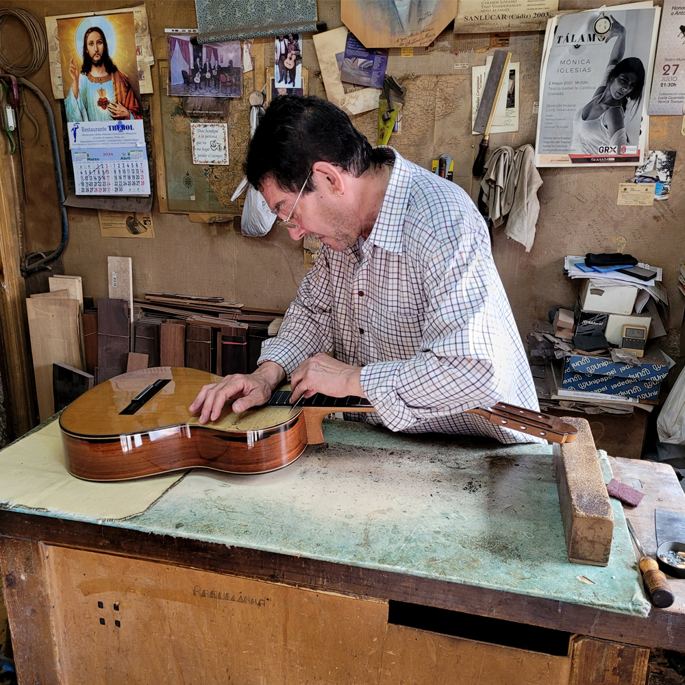 • José Marín Plazuelo began making guitars in 1974 at the age of 14 under the guidance of his uncle, world-renowned guitar maker Antonio Marín Montero. With a guitar-making career spanning over 40 years and today Plazuelo is one of the best guitar makers in Spain.