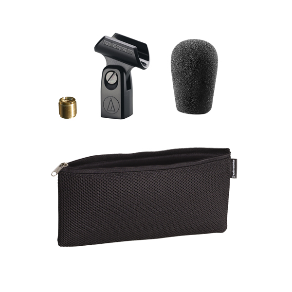 • ACCESSORIES FURNISHED: AT8405a stand clamp for 5/8″-27 threaded stands; 5/8″-27 to 3/8″-16 threaded adapter; AT8159 windscreen; soft protective pouch