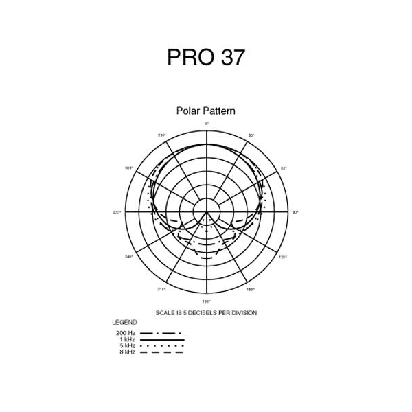 The PRO 37 has established itself as a versatile solution for studio recording and live performance. With a low-mass element for superb transient response and a low-profile design for optimal mic placement, this mic excels in high-SPL applications. It is ideal for acoustic guitar, overheads, piano and group vocals. Its cardioid polar pattern reduces pickup of sounds from the sides and rear, improving isolation of the desired sound source.