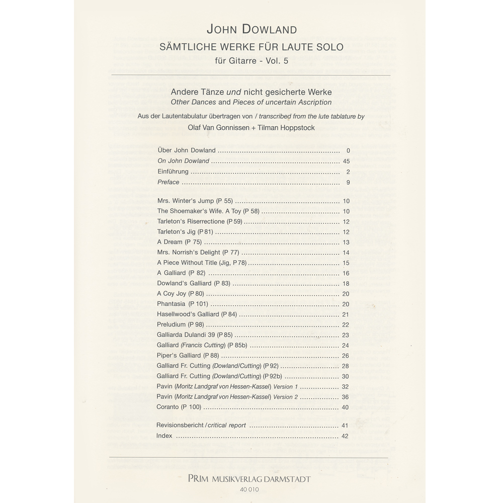 This last volume completes the lute works by John Dowland series. The carefully compiled booklet with a total of 21 pieces contains a prelude and a phanatsia as well as various dances and some works not definitely attributed to Dowland. Supplemented by a comprehensive text and fingerings by the arrangers Olaf Van Gonnissen and Tilman Hoppstock.