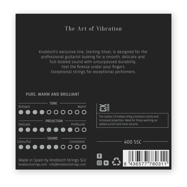 • Knobloch’s most exclusive strings, Sterling Silver basses bring a refinement to the sound through the use of this highly valued metal. These pure silver strings are in a league of their own. The high-quality sterling silver gives a warm and pure sound with a profound sustain. They offer an unsurpassed durability, retaining their brilliance and warmth longer than other strings. Designed for the professional guitarist looking for a smooth, delicate and full-bodied sound with unsurpassed durability.