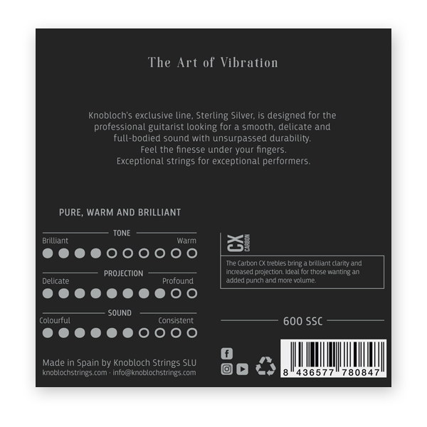 Knobloch’s most exclusive strings, Sterling Silver basses bring a refinement to the sound through the use of this highly valued metal. These pure silver strings are in a league of their own. The high-quality sterling silver gives a warm and pure sound with a profound sustain. They offer an unsurpassed durability, retaining their brilliance and warmth longer than other strings. Designed for the professional guitarist looking for a smooth, delicate and full-bodied sound with unsurpassed durability.
