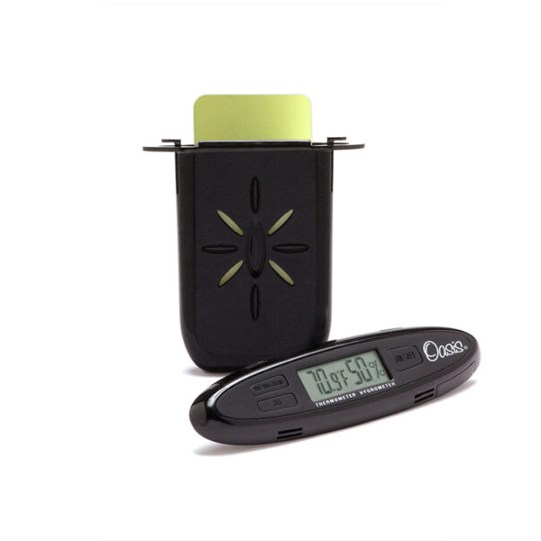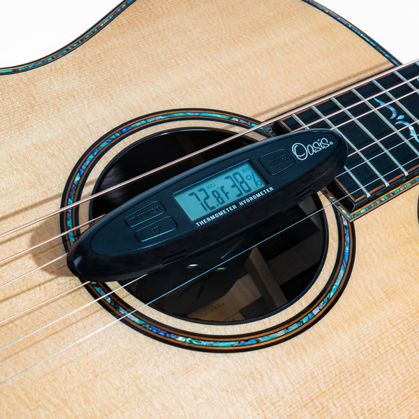 Oasis® HH Combo OH-30 humidifier/hygrometer. The Oasis HH Combo is the only humidifier/hygrometer designed to fit in the sound hole of a steel string acoustic guitar. When using a humidifier to boost the humidity inside a musical instrument it is important to monitor humidity levels. Otherwise, maintaining correct humidity is just guesswork. The HH Combo has two parts. Above the strings, the upper portion of the unit contains a clearly visible and accurate hygrometer, which can be calibrated by the user if necessary. The humidifier clips securely into the bottom of the hygrometer. Suspended by the strings, the humidifier releases moisture evenly and slowly inside the guitar yet never touches the instrument body. A specialized, drip resistant, sponge holds 10 times its dry weight in water, which allows for a longer periods between refills. There are four openings on each side of the humidifier for the water vapor to escape. This is sufficient for most dry areas. In dryer climates like Arizona, there are 4 additional openings which can be punched out to provide more humidity. The sponge is easily recharged by moistening the sponge with distilled water. Using the HH Combo during dry months will protect your instrument safe from cracks and warping.